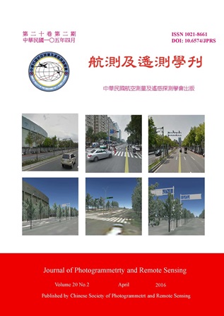 本文根據瀝青路面及道路交通標線之光達回波強度的差異性,設計高斯曲面匹配(Gaussian Surface Matching, GSM)法,以求定直線型交通標線之線特徵參數,進而求得垂直交會的兩條直線標線之交點,並由不同航帶的光達點雲同名交點來估計與改正相鄰航帶點雲坐標基準偏差量,俾使用標線交點群來求解空照影像的外方位元素,使兩者建立在共同的坐標系統之中,以利後續空載光達與航空攝影測量的整合應用。經由實際資料測試,光達航帶點雲坐標基準經改正後,同名交點之整體平面偏差量之均方根值從0.650m降至0.286m,符合光達點之先驗平面精度±0.25m。使用這些基準改正後的點位做為地控點(共30點),施行空照影像光束法平差,整體空三精度達到±0.67個像元的次像元精度等級。