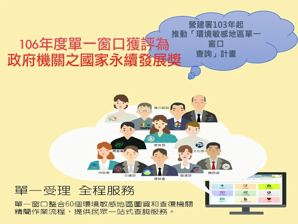 此項工作至少涉及30個查復機關。 過去查詢申請人分別向各環境敏感地區主管機關申請,時間冗長成本高。